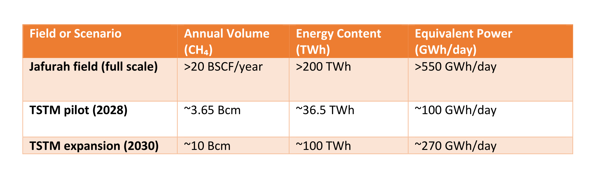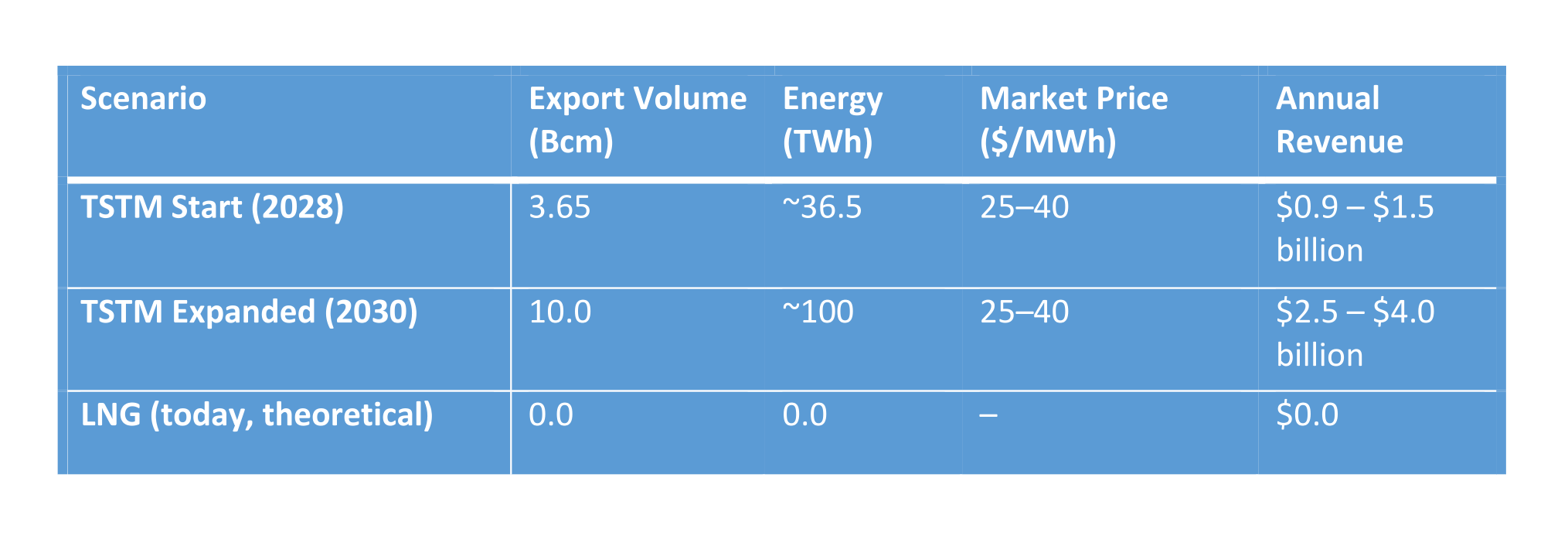 TSTM Start (2028): 3.65 Bcm, ~36.5 TWh, 25–40 $/MWh, $0.9–$1.5 billion