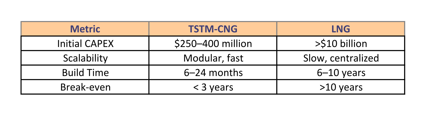 Risk mitigation: TSTM requires only 2–5 % of LNG CAPEX, with break-even in <3 years, and reduces geopolitical risks through independent logistics.